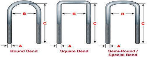 When placing your order, please have the following information available: 1. The Thread size of your UBolt. This represents letter "A" as shown in the picture. Available Rod Sizes: 3/8, 7/16, 1/2, 9/16, 5/8, 3/4, 7/8, 1", 1 1/8", and 1 1/4". 2. The inside width of your UBolt. This represents letter "B" as shown in the picture. 3. The inside length of your Ubolt. This represents letter "C" as shown in the picture 4. We will need to know if your UBolt has a Round Top, Square Top, or Semi-Round Top. Examples of these different bends are displayed in the picture.